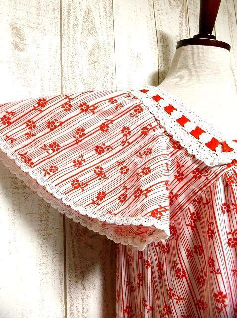 ☆ USA古着 ストライプ柄×小花柄♪アンティークリボン×お花レース装飾!!レトロガーリーアンティークワンピース ☆
