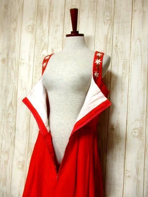 ディアンドル ヨーロッパ古着 Red Color地にお花刺繍がぷっくり浮かび上がる♪大人レトロフォークロアなチロルワンピース ドイツ民族衣装フォークダンス オクトーバーフェストにもおすすめ ☆
